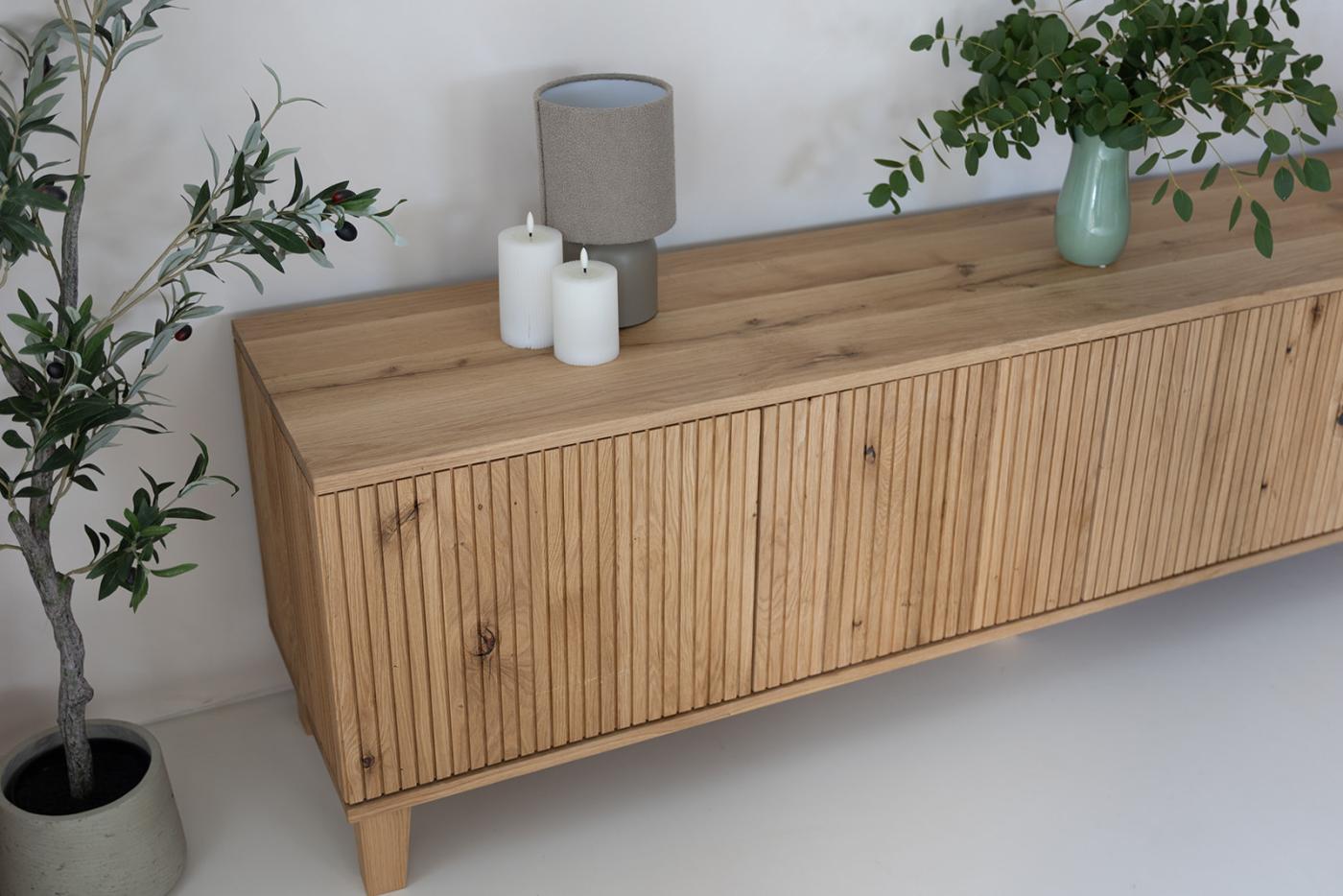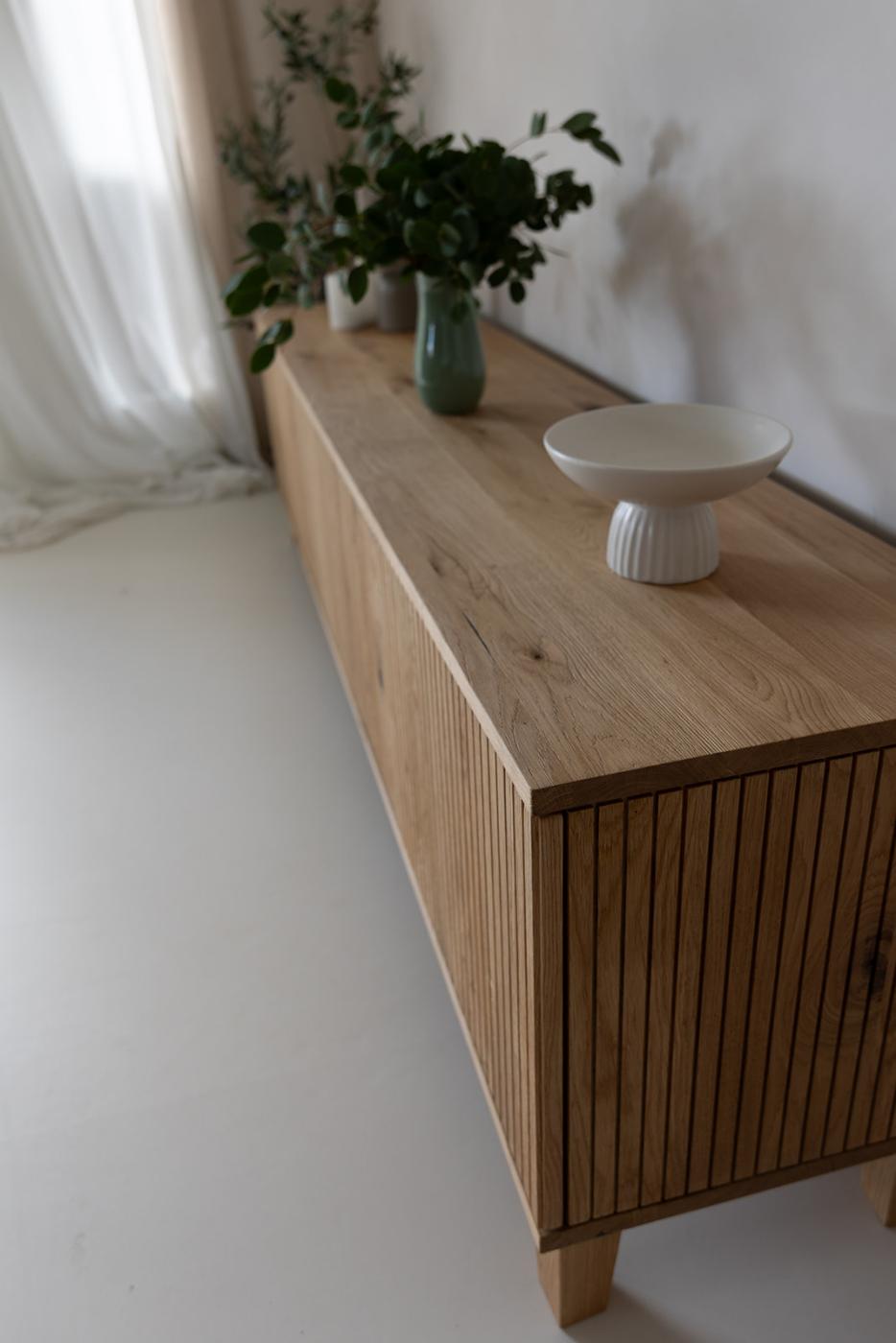 Komoda pod TV MOLIENDA je celá vyrobena z masivního dubového dřeva a má vertikálně frézované čelo i bočnice. Komoda je rozdělena na čtyři oddíly a poskytuje dostatek úložného prostoru pro přehledné uschování multimediálních zařízení, kabelů a dálkových ovladačů. Zádní strana komody je volná - přizpůsobena pro vedení kabelů. MOLIENDA je opatřena prvotřídním dotykovým kováním.
