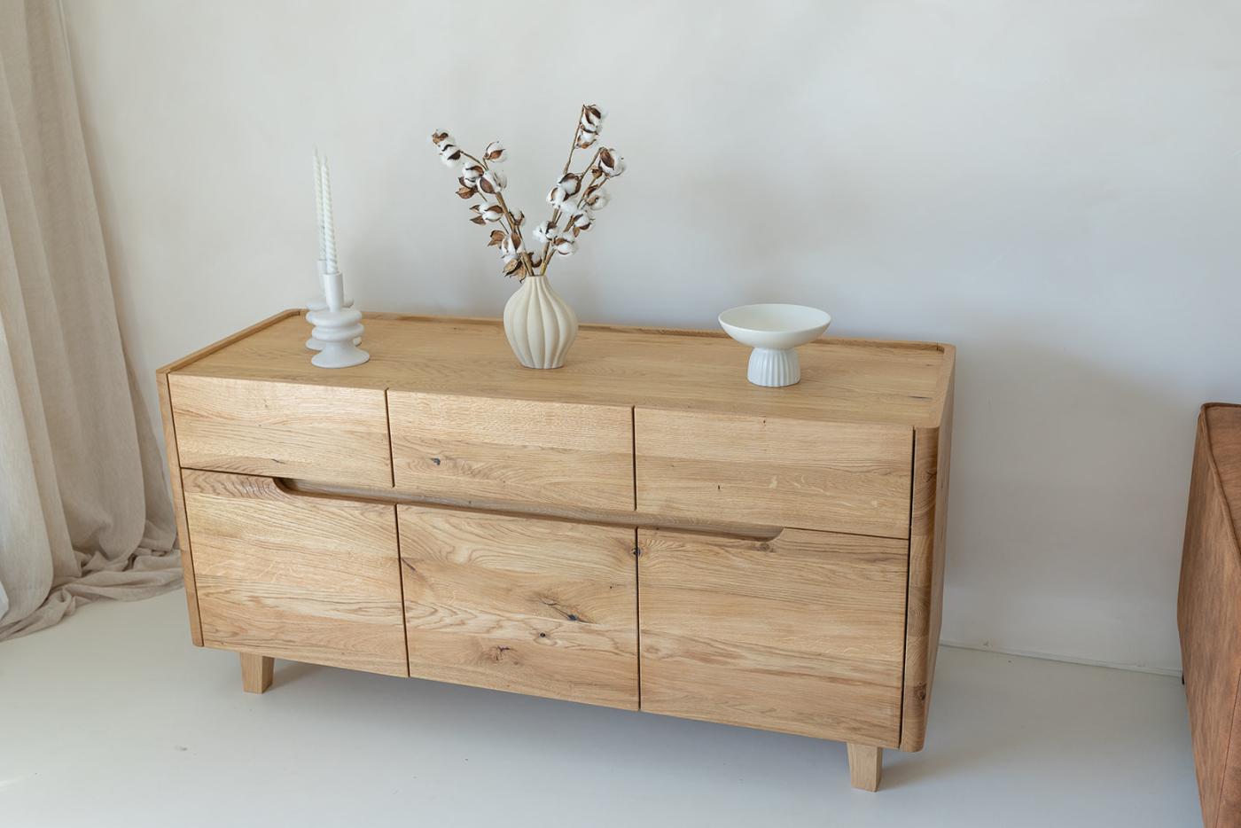 Komoda PRECIOSA Trio je vyrobena výhradně z lehce kartáčovaného dubového masivu, který odhaluje jedinečnou kresbu dřeva. Každý kus je originál – s duší přírody a precizností českého truhlářství.