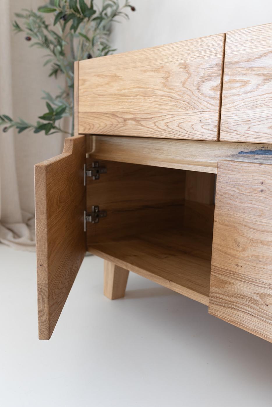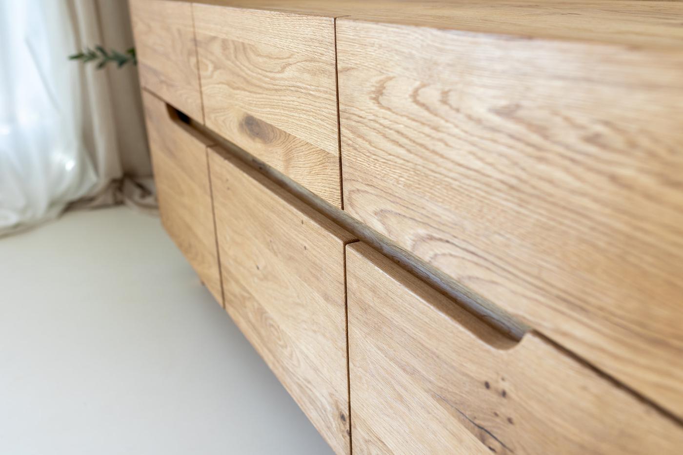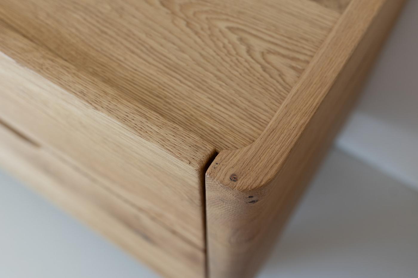 Dubová komoda PRECISE je skvostem truhlářského řemesla. Hrany komody jsou precizně zaobleny. Dvířka a šuplíky jsou opatřeny prvotřídním dotykovým kováním. ko