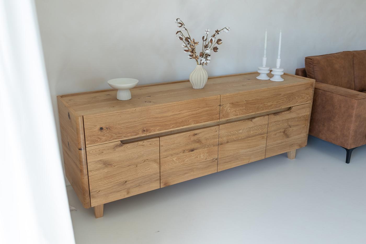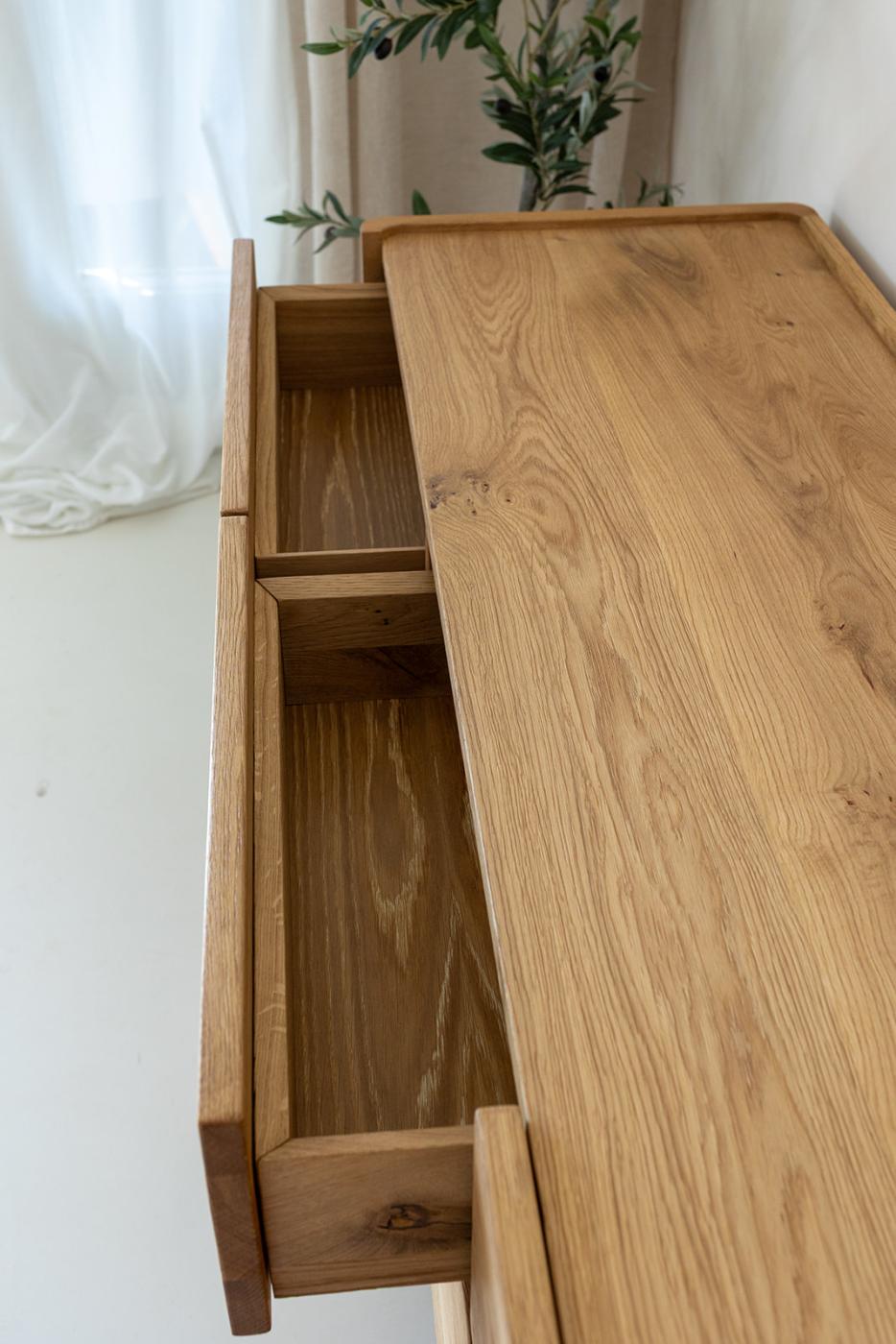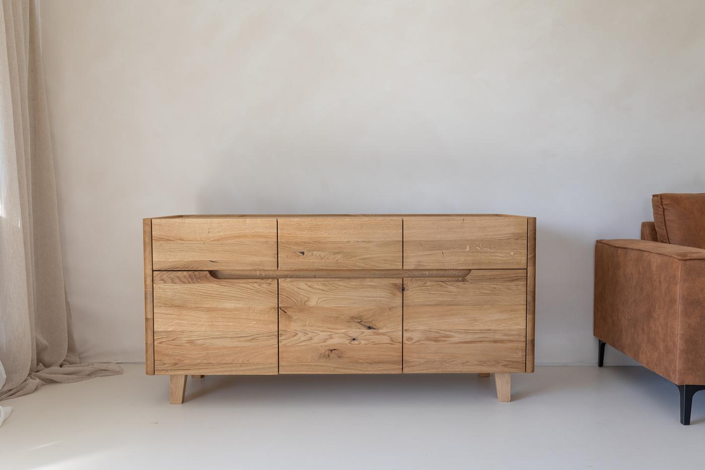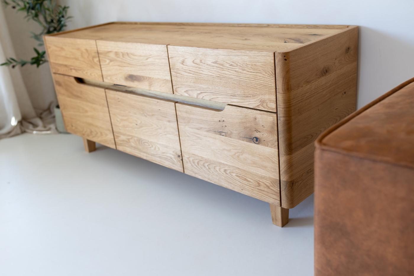 Dubová komoda PRECISE je skvostem truhlářského řemesla. Hrany komody jsou precizně zaobleny. Dvířka a šuplíky jsou opatřeny prvotřídním dotykovým kováním. ko