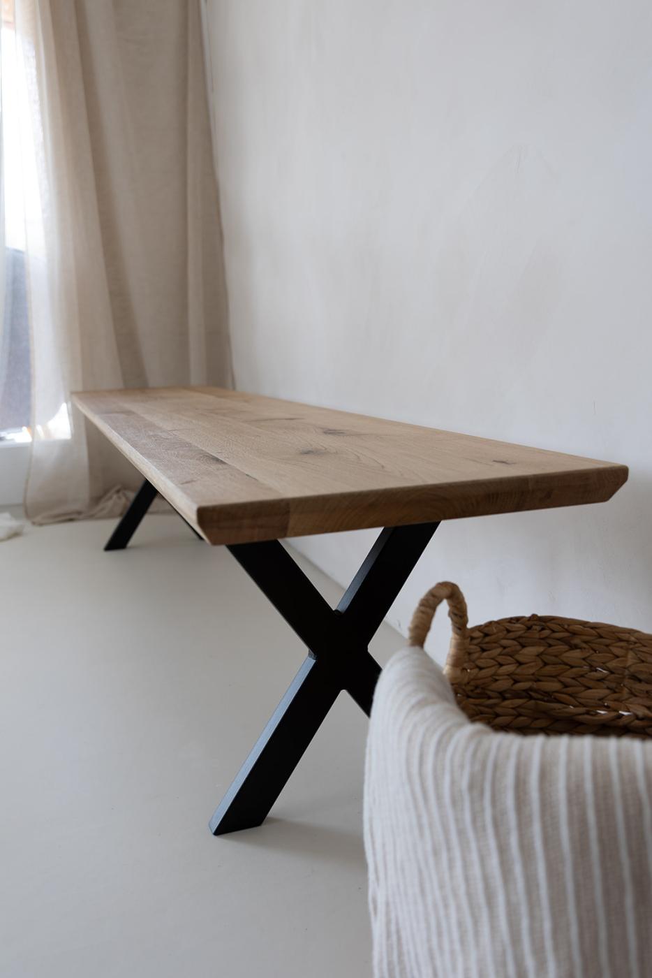 Dubová lavice s kovovou podnoží XENIA má masivní dubovou sedací část v síle 4 cm, která je lehce vykartáčovaná pro vyniknutí překrásné kresby dřeva, hrana desky je zkosená. Kovová podnož ve tvaru písmene X. Interiéru propůjčuje industriální vzhled. Pokud jste zde nenašli rozměr, který potřebujete, neváhejte nás kontaktovat.