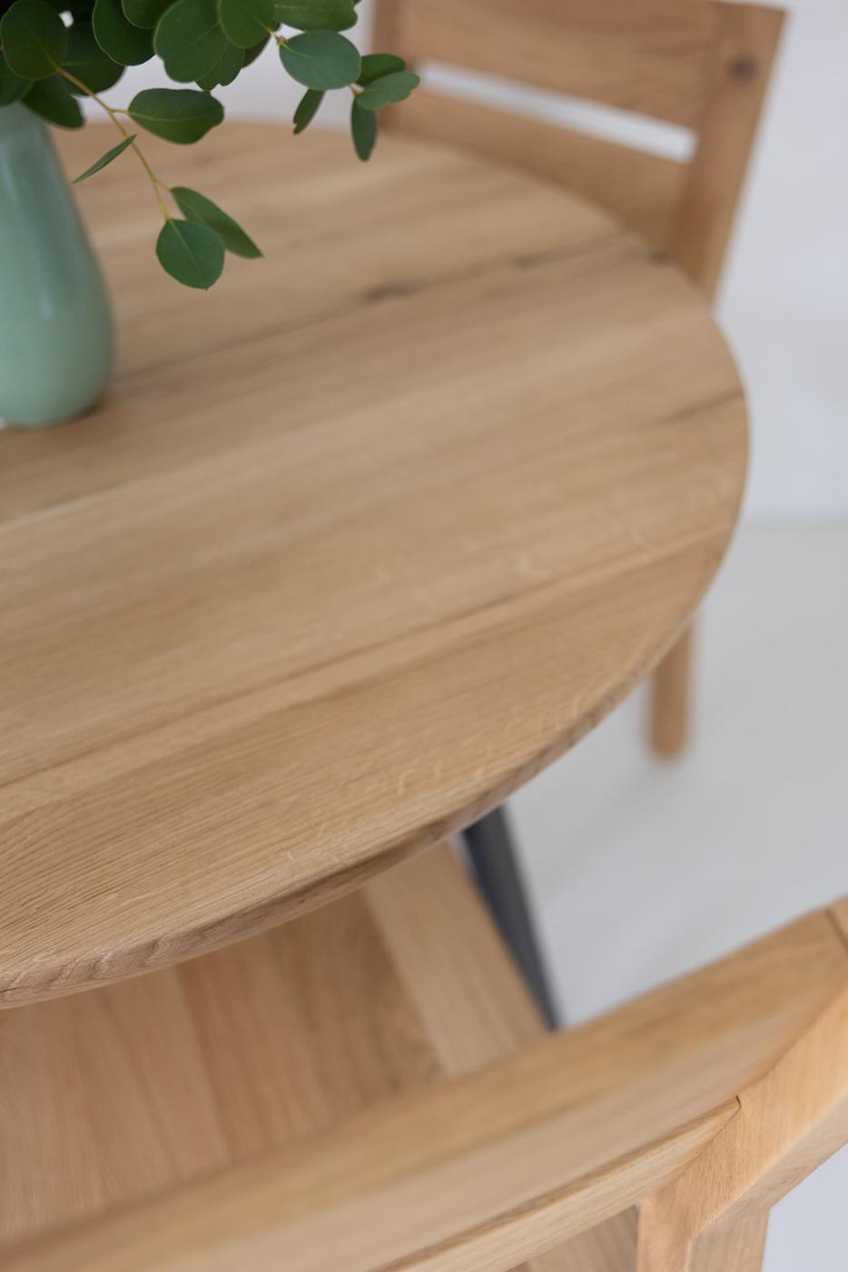 Kulatý dubový stůl s kovovou podnoží ROUND spojuje moderní kovovou stolovou podnož s kruhovou masivní dubovou deskou. Jemně opracovaná hrany masivní dubové desky přispívají k jeho sofistikovanému vzhledu. Dubový kulatý stůl ROUND propůjčuje prostoru eleganci. Povrch desky stolu je jemně kartáčovaný, aby ještě více vynikla neopakovatelná kresba dřeva.