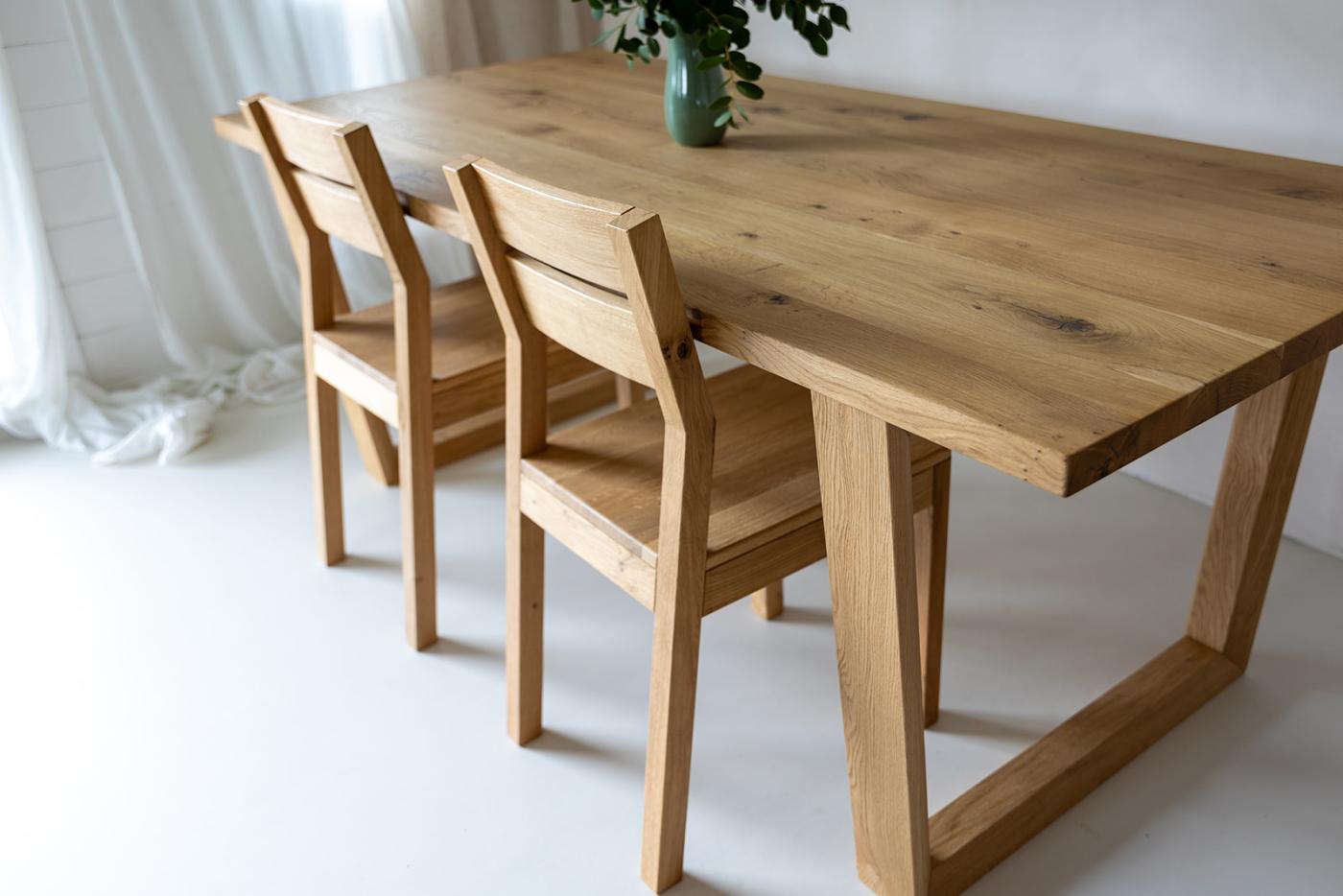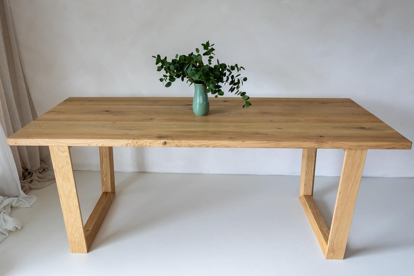 Dubový jídelní stůl VOGUE s dubovou podnoží do tvaru V. Deska stolu v síle 4 cm je vyrobena z lehce kartáčovaného dubového masivního dřeva. Hrana stolu je kolmá.